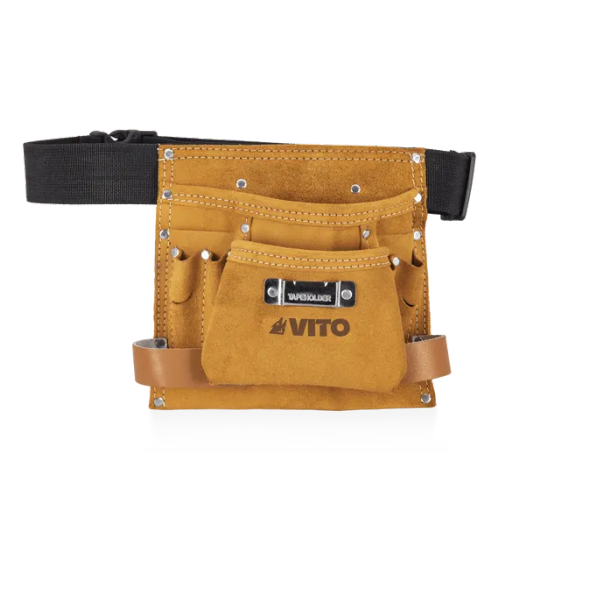 • Bolsa simples em couro para ferramentas, com 8 bolsos e 2 porta martelos e cinto com fecho rápido.